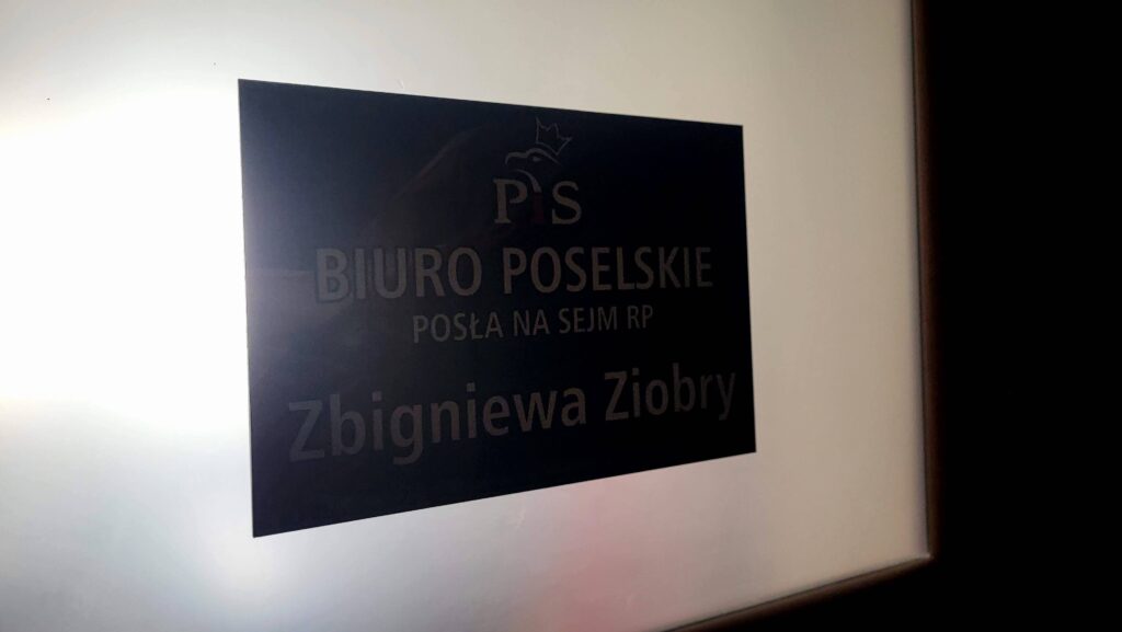 Dalej są biura m.in. posła Krzysztofa Sobolewskiego, europosła Bogdana Rzońcy, posła Marcina Warchoła i na samym końcu, w ciemniejszej części korytarza – zamknięte na głucho biuro byłego prokuratora generalnego Zbigniewa Ziobry. Na tablicy tylko imię i nazwisko posła. Brak informacji o godzinach pracy i adresu e-mail, czy numeru kontaktowego.