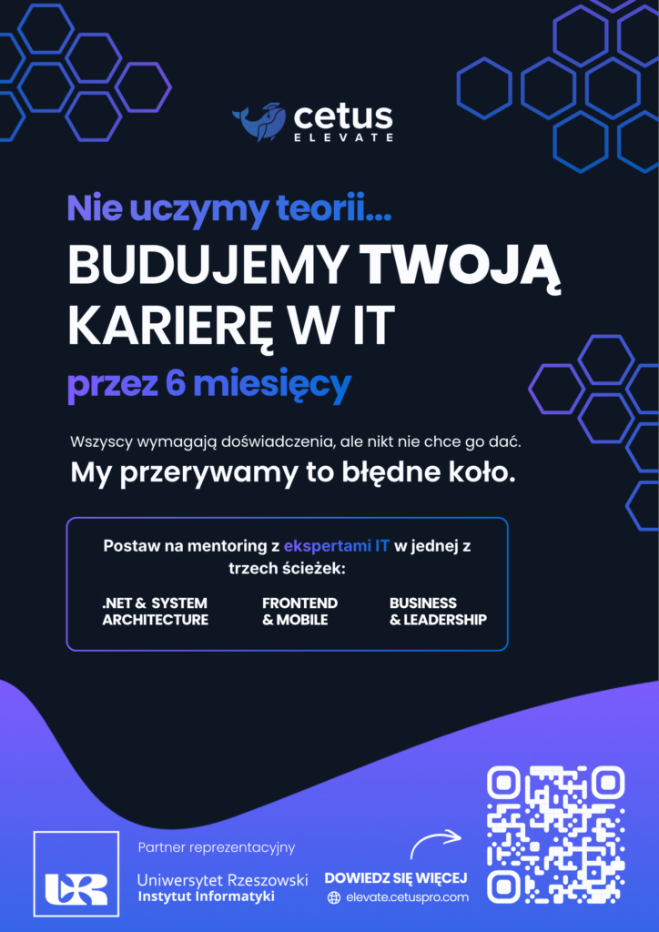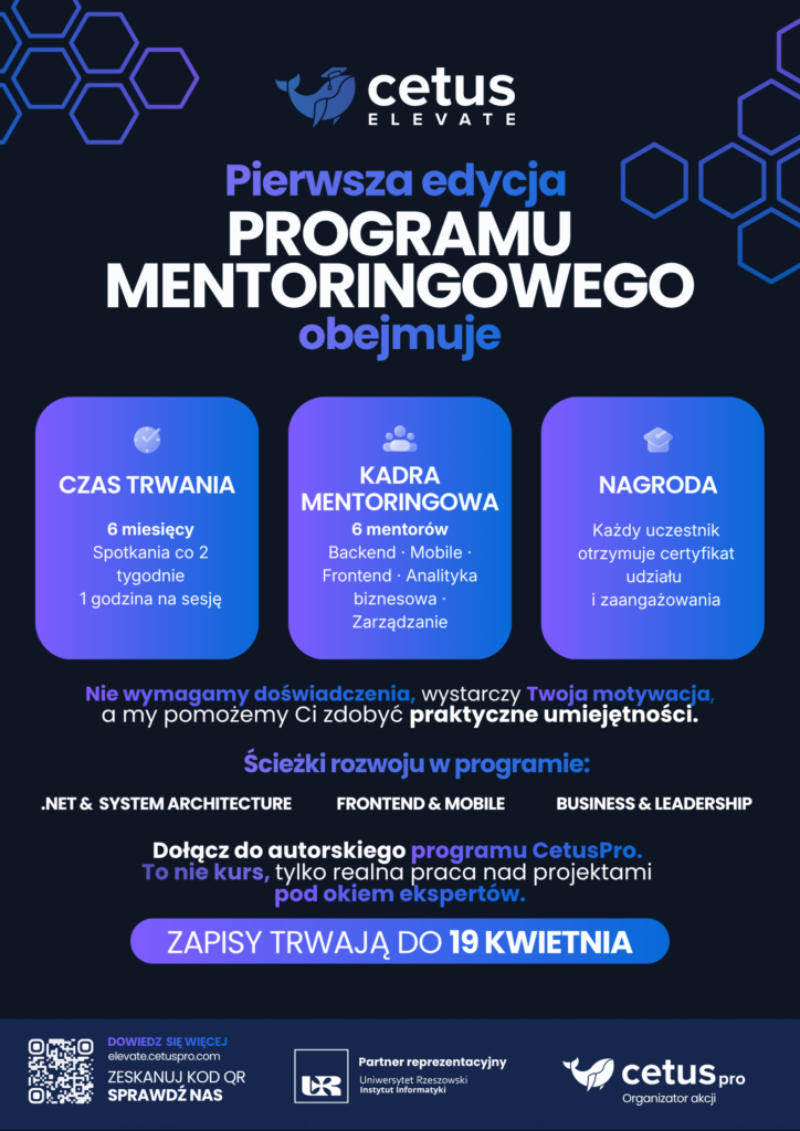 Mieszkasz na Podkarpaciu i interesujesz się branżą IT? To może być właśnie Twoja szansa. Rzeszowski software house CetusPro we współpracy z Uniwersytetem Rzeszowskim i Instytutem Informatyki UR uruchomił wyjątkowy program mentoringowy – CetusElevate. Rekrutacja trwa tylko do niedzieli, 19 kwietnia!